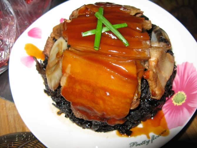 3、老家寄来的梅干菜洗净(要多洗几次,因为那是用酱油和盐腌制的,超级咸,不洗几遍会很咸的),均匀的放在五花肉上,压实,腌制20分钟以上。千万不能放盐和酱油。梅干菜里面已经有了,适当的放一点点白酒或黄酒很提香的!