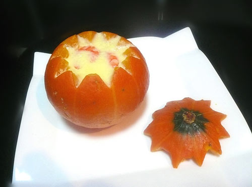 及以下步骤:吃着真的很香甜。 小金瓜一个,洗净。 从顶部刨开,掏空瓜瓤瓜子。 小金瓜一个,洗净。 从顶部刨开,掏空瓜瓤瓜子。 准备一个鸡蛋和几个虾仁。 温水将鸡蛋打开,倒入瓜内,快熟时再放虾仁。 盖上盖子,蒸10分钟左右。 蒸好的蛋羹。 吃着真的很香甜。