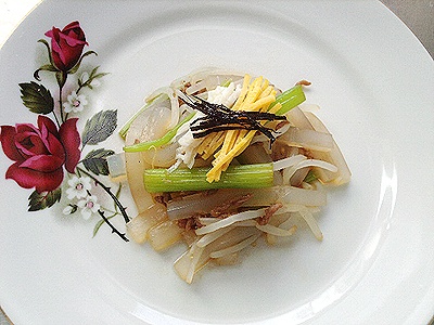 胡椒粉(0.3g() / 盐(1g) / 糖(18g) / 酱油(适量) / 鸡蛋(60g) / 红辣椒(2g) / 食用油(4g) / 醋(13g) / 葱末(4.5g) / 水(400g) / 蒜泥(2.8g) / 绿豆芽(100g) / 芝麻油(2g) / 紫菜(2g) / 芝麻盐(1g) / 水芹菜(50g)