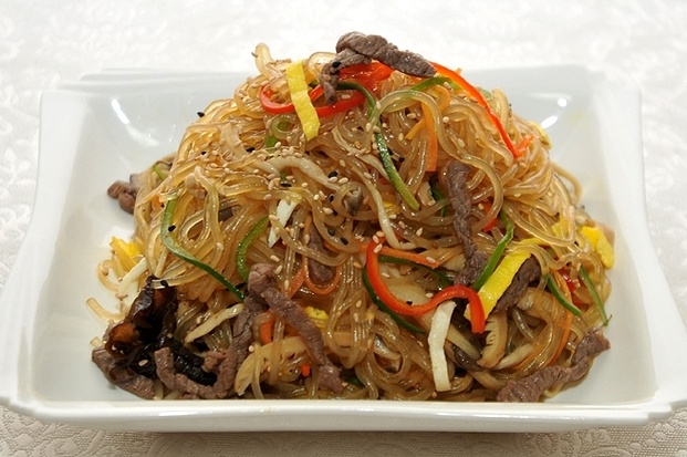 什锦拌粉丝,是用煮熟的粉丝和多种炒制的蔬菜一起搅拌制作的。在宴会和节日里最常见的什锦拌粉丝,本来是用黄瓜,萝卜,绿豆芽,桔梗等煮熟的山菜混合后,放入调料的宫廷饮食,不过现在粉丝变成主材料。朝鲜时代的光海君(1608∼1623在位)问:没有什么值得吃的食物吗的时候,叫做李忠的人就做给她进贡了什锦拌粉丝这道菜,光海君非常满意这道菜的味道,因此给了李忠很丰厚的赏赐。