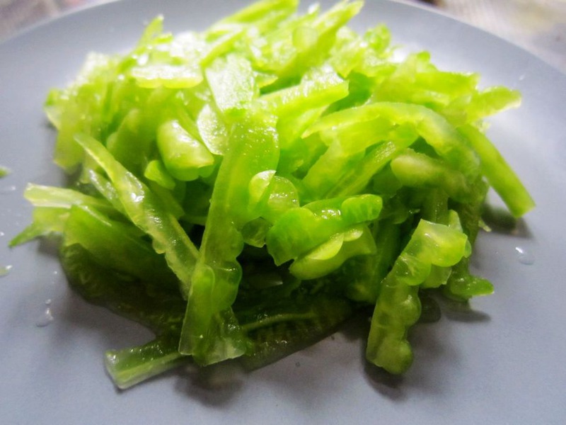 4、将苦瓜绿皮改刀切丝。