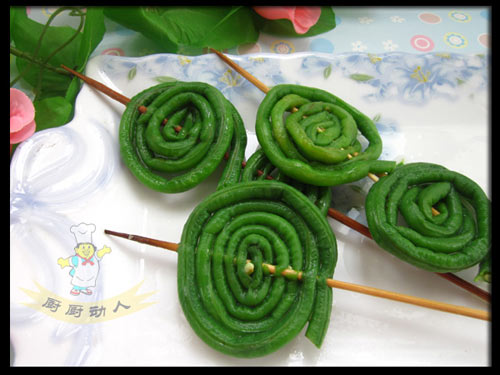 及以下步骤:锅中放入清水,把豆角放入烧开的水中焯熟。 新鲜豆角洗净,最好选长短一样的。 锅中放入清水,把豆角放入烧开的水中焯熟。 新鲜豆角洗净,最好选长短一样的。 锅中放入清水,把豆角放入烧开的水中焯熟。 新鲜豆角洗净,最好选长短一样的。 锅中放入清水,把豆角放入烧开的水中焯熟。 捞出豆角凉水冲一下,放在菜板上,一只手按住豆角的一头,另一只手拿起豆角卷成圆圈。 用竹签串起来。 大蒜捣碎,加盐、鸡精、香醋、香油、芝麻酱调成汁,吃的时候烧在棒棒糖上。