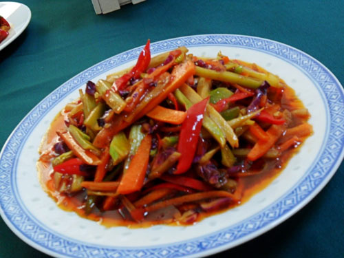 平时我们在家做菜时有些菜的根茎就给扔掉了,比如西兰花的根茎,扔掉真的很可惜,拿它切片、切丝炒肉丝,配菜都很好,这道菜就是用了容易丢弃的根,虽然全是蔬菜,但用鱼香味炒制,很是爽口。