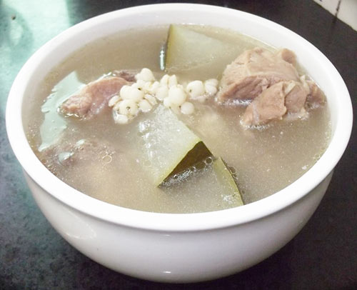 冬瓜汤是清热解暑、健脾利尿、除烦止渴。冬瓜薏米猪骨汤是一道好味兼养颜的靓汤 薏米:性微寒,有健脾利水、利湿除痹、清热排脓、清利湿热之功效 。 冬瓜:止渴、消痰、利小便,味甘,性微寒。功能利水祛湿,通利二便,清肺化痰。捣成汁服,可止消渴烦闷,解毒。 材料:猪骨250克 冬瓜1000克 薏仁米100克 蜜枣1粒, 姜3片 做法:冬瓜连皮带囊仔,洗净切块;薏米稍浸泡多洗几次、蜜枣洗净;猪骨洗净。全部用料放入汤煲,大火煮开,改文火煲2小时,调味食用。