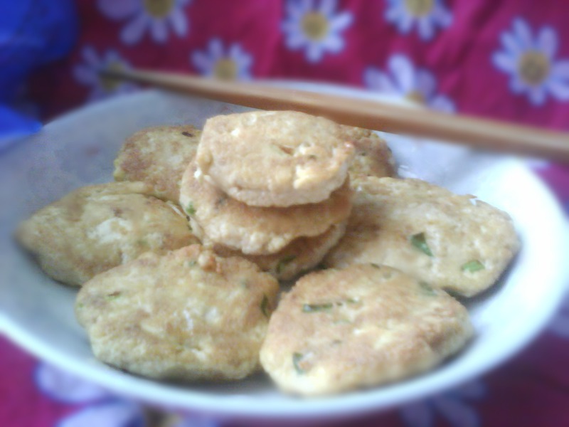 6、将调好的豆腐碎拍成小饼,放入锅中。