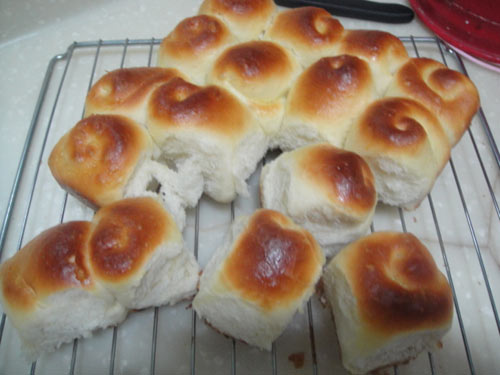 及以下步骤:搓圆盖保鲜膜,旸15分钟。 取一份,擀成长条形状。 由上至下卷起来。 把面卷从中间切开。 切口朝下,排入模具,模具里放一层植物油防粘。放烤箱里,40度发酵40分钟。烤箱底部要放一碗热水保持湿度。 取出,表面刷一层鸡蛋液。 烤箱预热200度,15分钟即可。 看看怎么样吧。请来一块。 烤箱预热200度,15分钟即可。 看看怎么样吧。请来一块。