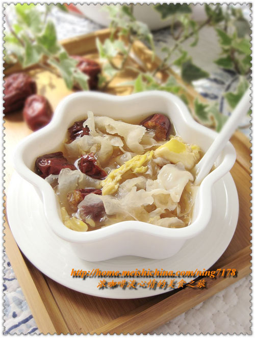 及以下步骤:红枣洗净去核。 银耳用水泡软,洗净,撒成小块。 红枣洗净去核。 银耳用水泡软,洗净,撒成小块。 红枣洗净去核。 银耳用水泡软,洗净,撒成小块。 将银耳、红枣一起放入锅中,加入适量清水,用文火煮30分钟。 加入适量冰糖煮化。 最后打入整颗鸡蛋。 用勺子稍微搅拌,煮沸即可。