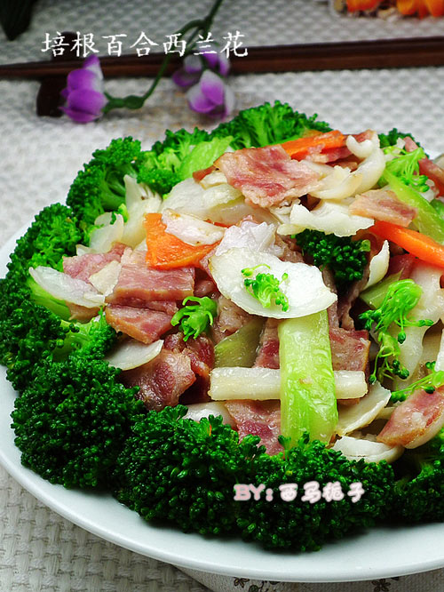 及以下步骤:再加入百合,水沸后捞出沥水。 锅中放入少许的油,下入培根煸炒。 加入葱碎炒至培根断生。 倒入焯水的百合 胡萝卜 莲藕 西兰花梗煸炒均匀。 加入盐和鸡精调味, 芶入薄芡,淋入香油,倒在成有西兰花的盘子里即可。 加入葱碎炒至培根断生。 倒入焯水的百合 胡萝卜 莲藕 西兰花梗煸炒均匀。 加入盐和鸡精调味, 芶入薄芡,淋入香油,倒在成有西兰花的盘子里即可。
