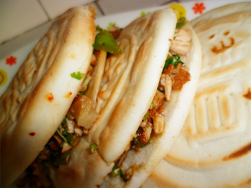 及以下步骤:把肉肉切成小方块,和红烧肉的那种大小差不多。 这些大料,其实就在超市里买那种炖肉料包就行。大葱,姜块准备下,对了,最好的是来一小块冰糖。爆肉用冰糖颜色也会很有色泽! 把肉肉切成小方块,和红烧肉的那种大小差不多。 这些大料,其实就在超市里买那种炖肉料包就行。大葱,姜块准备下,对了,最好的是来一小块冰糖。爆肉用冰糖颜色也会很有色泽! 把肉肉切成小方块,和红烧肉的那种大小差不多。 这些大料,其实就在超市里买那种炖肉料包就行。大葱,姜块准备下,对了,最好的是来一小块冰糖。爆肉用冰糖颜色也会很有色泽! 锅烧热,放少量底油,爆香大料。将肉放入翻炒。炒至肥的部分微微出油。将老抽,冰糖碎,盐,胡椒粉放入继续翻炒。这样爆出来的肉,再去煮的,会肥而不腻。 在热锅中倒入沸水,煮开,撇去上面的血沫。改小火炖。至少炖两个小时。关火后闷数小时。告诉大家个简单方法,就是大火煮开之后,将其换到电饭煲里,这样,就不要看着它啦。最重要的是,保温功能可以让其更好地酥烂。晚上做最好,闷一夜可够味,不过现在是夏天天还太热不提倡。 把香菜,青椒,还有卤好的肉肉统统都切成碎丁。 将卤好的肉切碎,像剁肉馅那样,用刀一边切一边拌匀。饼从中间横切,不要切到底。将刚刚我们切好的肉肉放进去,还没结束哦。再撒点孜然粉,辣椒粉,才算大功告成!