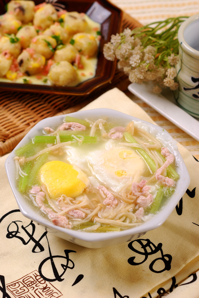 鸡蛋(3个) / 芹菜(25克) / 金针菇(50克) / 猪瘦肉(50克)