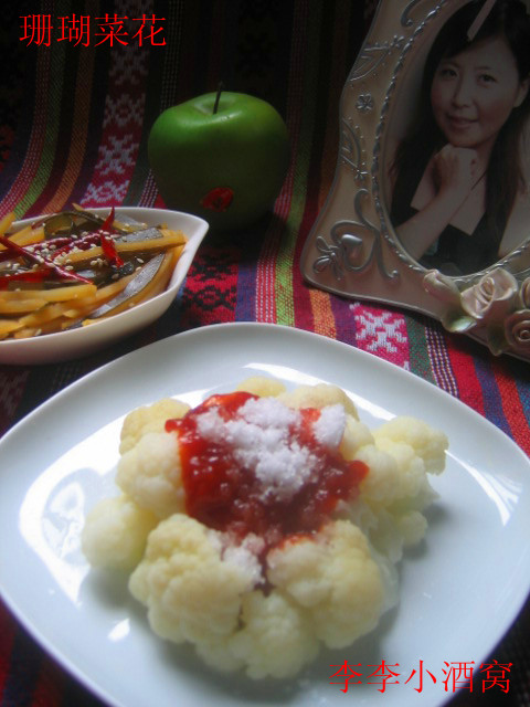及以下步骤:撒入白糖。 撒入鸡精。 上桌拌匀即可。 锅中水开放入菜花焯熟过冷水后沥水。 加入适量盐腌制15分钟,控去水分装盘。 锅中倒油,油温5成热放入番茄酱炒熟。 番茄酱晾凉后倒入菜花上。 撒入白糖。 撒入鸡精。 上桌拌匀即可。