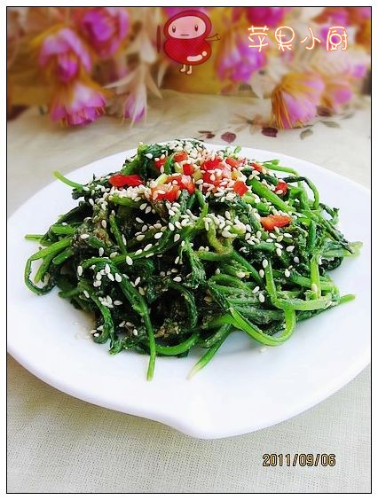 买到了新鲜的萝卜秧苗,我们当地一般洗净了拿它来醮甜酱吃。这次,我尝试将它用芝麻酱拌,相当的清淡爽口呢。