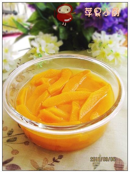 及以下步骤:入沸水锅中焯熟。 南瓜去皮去瓤切成长条。 入沸水锅中焯熟。 南瓜去皮去瓤切成长条。 入沸水锅中焯熟。 南瓜去皮去瓤切成长条。 入沸水锅中焯熟。 芒果果珍加入纯净水调开。 放入南瓜、蜂蜜调匀。 入冰箱保鲜室密封一个小时左右即可食用。