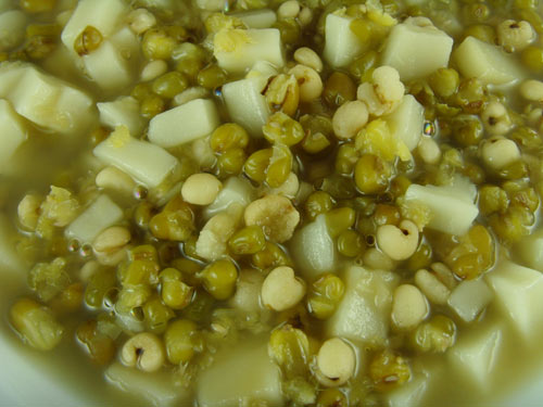原本想煲點綠豆薏米糖水, 放雪柜, 隨時取用. 但接到電話, 有朋友來訪, 剛好又是午茶時, 就急中生智在雪柜找出一小包年糕片, 想著切粒加入, 以增加口感, 也能充當午茶點心. 家里高壓锅在搬遷時搞丟了, 一直沒時間去買, 現只能用熱泡的方法, 用30分鐘加速制做, 下面同大家一起分享.