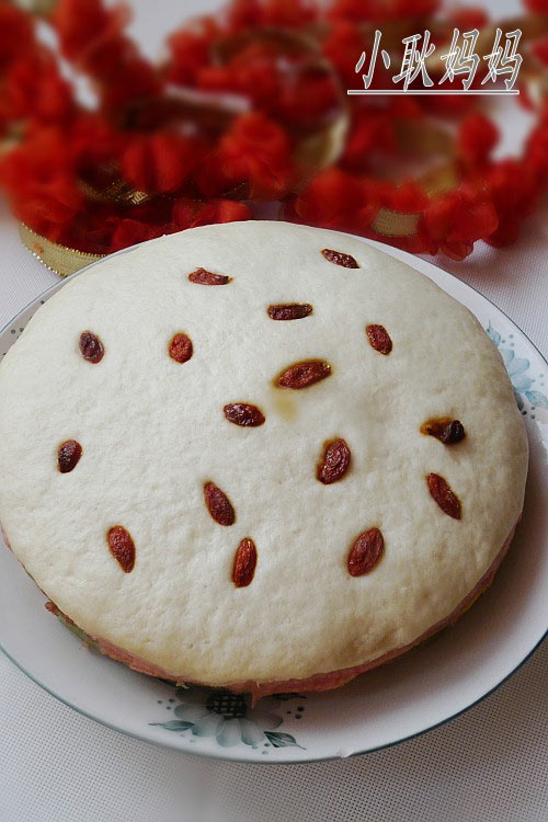 及以下步骤:所有的面团全部发好,白色的再分成两份全部擀成圆面皮。 在一张白色的面皮上撒上枸杞,压平。 把擀好的面皮逐片叠好,有枸杞的那张放最上面。 做好的蒸糕再醒发20分钟左右,冷水下锅烧开中火再蒸20分钟左右过两三分钟拿出。 切开就可以。 所有的面团全部发好,白色的再分成两份全部擀成圆面皮。 在一张白色的面皮上撒上枸杞,压平。 把擀好的面皮逐片叠好,有枸杞的那张放最上面。 做好的蒸糕再醒发20分钟左右,冷水下锅烧开中火再蒸20分钟左右过两三分钟拿出。 切开就可以。
