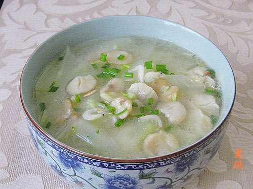 及以下步骤:加盐,鸡精,葱花,即可。 干蚕豆浸泡一夜,剥去壳,洗净,老黄瓜去皮待用。 锅里油热,放下蚕豆瓣煸炒。 干蚕豆浸泡一夜,剥去壳,洗净,老黄瓜去皮待用。 锅里油热,放下蚕豆瓣煸炒。 加一大碗清水,大火煮开,小火煮至豆瓣裂开。 用菜刀,边转动黄瓜,边把黄瓜削进锅里,黄瓜籽去掉。 放下洗净的虾米。 大火煮至黄瓜熟。 加盐,鸡精,葱花,即可。