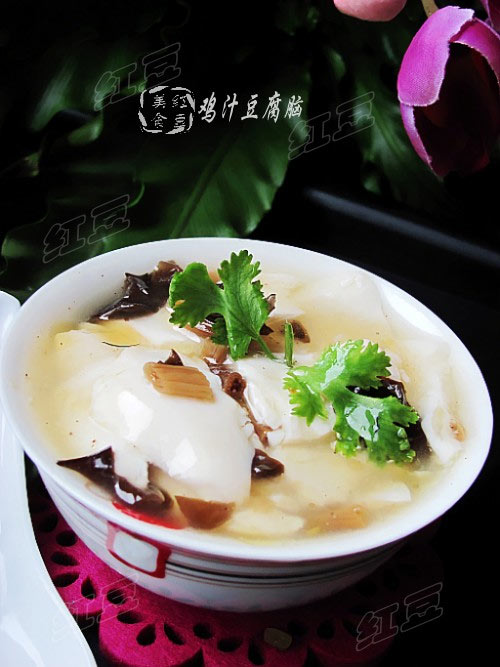 及以下步骤:把炒过的木耳和黄花菜倒入鸡汤中。 大火煮开小火烧至,加入盐。 再加入胡椒粉调味。 煮上8-10分钟后加水淀粉勾芡。 搅拌均匀后关小火备用。 已经蒸好的豆腐用勺子片成小片放入碗中。 然后浇上一勺煮好的鸡汁汤,在淋入少许香油撒上香菜即可食用。 搅拌均匀后关小火备用。 已经蒸好的豆腐用勺子片成小片放入碗中。 然后浇上一勺煮好的鸡汁汤,在淋入少许香油撒上香菜即可食用。