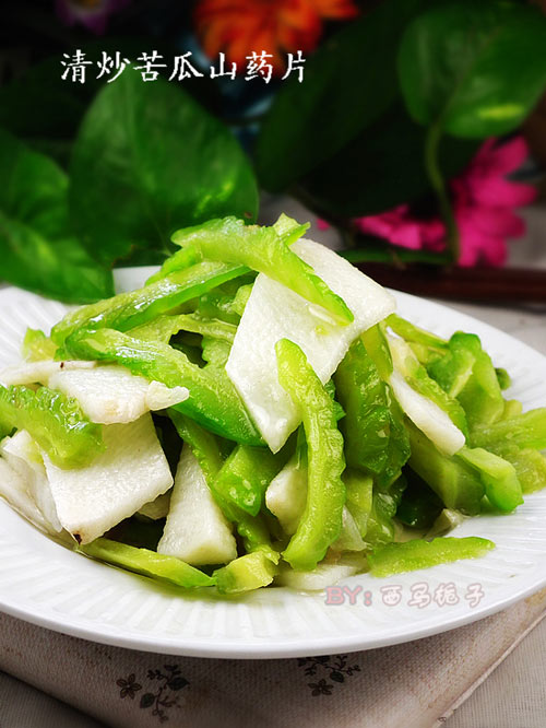 及以下步骤:加入盐和鸡精调味即可。 苦瓜去瓤去籽,切成斜片。 山药去皮切片。 苦瓜去瓤去籽,切成斜片。 山药去皮切片。 大蒜切片备用。 锅中放水烧开,下入苦瓜片和山药片焯水。 锅中注油爆香蒜片。 放入沥干水的苦瓜片和山药片翻炒。 加入盐和鸡精调味即可。