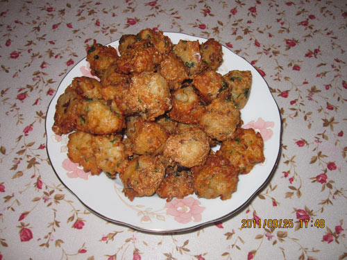 及以下步骤:还需要在进行第二遍炸,这样的丸子酥脆。 好了,一盘好吃香酥的藕丸子出锅了,欢迎大家品尝。 原料有藕,香菇,香菜。 香菜洗净切碎。 香菇洗净剁碎。 藕洗净打去表皮,用刀切碎。 加入适量的糯米粉,粘稠度为用手能捏出丸子,就好了。 将捏好的丸子放在漏勺上,入微热的油锅中先预热,成型后,放入油锅中小火炸。 还需要在进行第二遍炸,这样的丸子酥脆。 好了,一盘好吃香酥的藕丸子出锅了,欢迎大家品尝。
