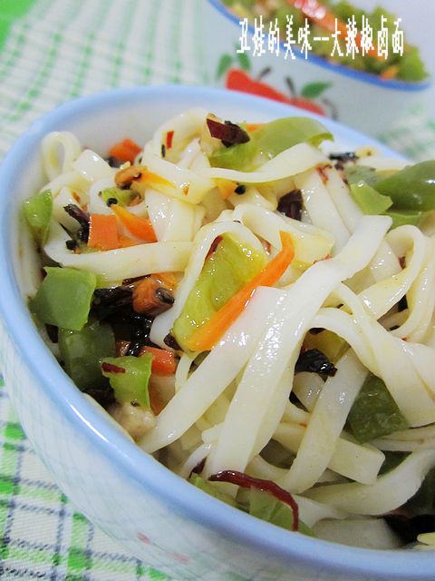 及以下步骤:放入大辣椒丁翻炒均匀。 调入酱油和盐。 放水稍炖一会,并水淀粉勾芡出锅。 另起锅煮熟面条捞出后过水,淋上大辣椒卤即可。 油热后放入肉片翻炒至发白。 放入葱姜末及胡萝卜丝继续翻炒。 放入大辣椒丁翻炒均匀。 调入酱油和盐。 放水稍炖一会,并水淀粉勾芡出锅。 另起锅煮熟面条捞出后过水,淋上大辣椒卤即可。