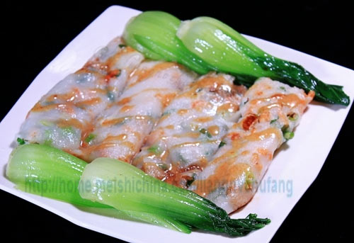 及以下步骤:锅下微火,将洗好控干水的虾米准备好。 在粉浆略成型,但是表面还软时均匀撒上虾米和葱花,不要撒的太密,否则卷起来容易断。 在表面加一点生粉浆,然后转一圈锅,让浆液均匀,不可加的太多,以免太厚。 盖上锅盖焖一分钟。(时间不可多不可少,影响口感) 关微火,开盖。 卷起,卷的时候用木铲或者硅胶铲来卷,不要用筷子或者金属铲,这就是卷肠粉的过程,这样一片片卷起来做好之后放在盘子里备用。 将做好的肠粉切成两半放入热油锅中煎制。 在锅中内都放入肠粉,要有间隙,这样好翻动。 微火煎到有米香味就可以翻面。 只要加上汆烫过的小棠菜,摆盘淋上酱汁即可食用。(附带一个粤式经典酱料制作方法,用小匙羹,芝麻油一勺,豉油3勺,白糖一勺,用大匙羹舀一大匙芝麻酱,一大匙胡麻酱,加少许水在小锅中用小火不停搅动煮开就是酱汁,豉油一定要选择海鲜豉油,或者广东产,港产的生抽,其他地方产的豉油死咸,不可选择)