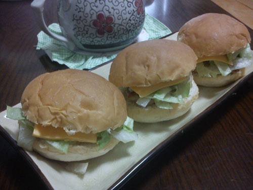 自己做的小汉堡,用料十足,味道十足~~保证让你两口吃掉一个以后还想接着吃~~(*^__^*) 嘻嘻……