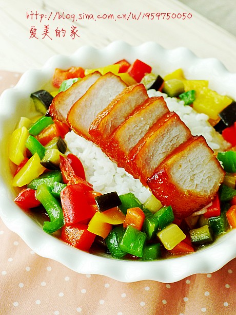 及以下步骤:将所有蔬菜丁一起倒入,快速翻炒。 加少许耗油,盐,鸡精后勾薄芡出锅。 将烤好的叉烧肉稍凉后切片摆在盛好饭菜的盘中即可。 烤盘内铺锡纸将腌好的肉置于烤网上,刷上一些腌制的酱汁,放入预热200度的的烤箱中烤约20分钟。20分钟后将肉取出翻面,再将剩余的酱汁均匀地刷在肉上,继续烤10分钟至熟即可出炉。 烤肉的时候准备蔬菜,将青椒,红椒,黄椒,胡萝卜,茄子切小丁,葱切段,蒜切片。 锅中烧开水,先将胡萝卜茄子放锅中煮,熟后将青椒,红椒,黄椒放入,烫一下即可一起出锅。 锅中热油,将葱蒜炒香。 将所有蔬菜丁一起倒入,快速翻炒。 加少许耗油,盐,鸡精后勾薄芡出锅。 将烤好的叉烧肉稍凉后切片摆在盛好饭菜的盘中即可。