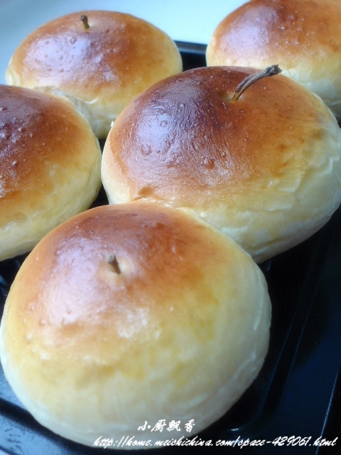 本来,我是想做北海道土司的,可是后来临时又决定做小面包,再后来,又决定做夹馅的面包,最后,就做了现在看到的苹果馅的面包。所以,方子是北海道土司(中种)的方子。 话说自打我学会了北海道土司(尤其是中种法的),我们家也不知道做了多少个,反正光淡奶油我就用了好几盒。自己吃,送人吃,百吃不厌,好评不断。 总是做这个北海道土司,我也想换换花样,但是换了花样又怕家里那两位不喜欢,人家爷俩都说了:还是北海道土司好吃,就做这个了,不吃别的了。可是我还是想换个样式来做。于是乎,今天临时决定改变,正好做了苹果酱,就来个奶香苹果面包吧! 下午面包烤好后,女儿闻到了香味,没等我拍完照,就拿一个吃,吃完又来要,一个劲说好吃好吃!这不,两个面包下肚,晚上饭都没有好好吃,说肚子好饱呢!