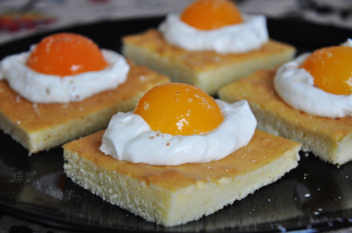 及以下步骤:取罐头杏子,小心地放再奶油上。最后撒上些杏仁粉末,即可。 蛋糕底部分:黄油和糖打发。 面粉和泡打粉用打蛋器搅散,搅拌均匀。 蛋糕底部分:黄油和糖打发。 面粉和泡打粉用打蛋器搅散,搅拌均匀。 将鸡蛋加入到黄油中去,电动打蛋器高速搅拌均匀。 将面粉分3次加入到黄油中去,低速搅拌均匀。此时面糊有劲,用低速搅拌会感觉又阻力。加入1-2勺牛奶,使面糊变成柔软,用电动打蛋器可以轻松搅拌的程度。 将面糊倒入模具中,铺平。放入预热好的烤箱,150度,约25分钟。烤好的蛋糕等凉。 蛋糕切成六块。伪糖心蛋部分:奶油加入糖粉和奶油稳定粉硬性打发。将打发好的奶油分到切好的蛋糕上。 取罐头杏子,小心地放再奶油上。最后撒上些杏仁粉末,即可。