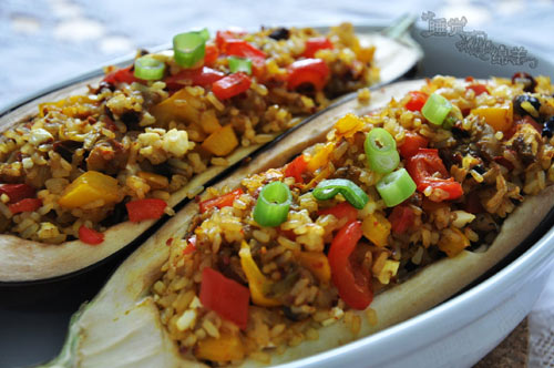 5、将混合好的米饭重新填入到茄子里去。茄子船表面刷上少量橄榄油。放入预热好的烤箱,150度,约20-30分钟,到茄子船开始变得焦黄。