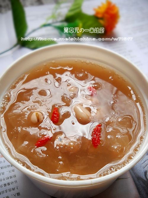 薏米是我国古老食药皆佳的粮种之一。薏米仁性味甘淡微寒,有利水消肿、健脾祛湿、舒筋除痹、清热排脓等功效,为常用的利水渗湿药。薏仁又是一种美食品,常食可以保持人体皮肤光泽细腻,消除粉刺、斑雀、老年斑、妊娠斑、蝴蝶 斑,对脱屑、痤疮、皲裂、皮肤粗糙等都有良好疗效。 薏米的美白功效是人所共知的,但健脾补肺也是它的一大功效。 花生具有滋补益寿、长生不老之功效,被誉为长生果。 薏米花生银耳羹是秋冬季节里的去火润肺之物,去火润肺、健脾祛湿、光泽肌肤••••••