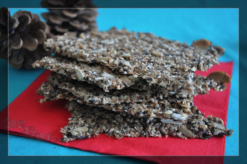 及以下步骤:加入坚果。今天用了葵瓜子、榛子碎和杏仁片。 加入水和盐,搅拌均匀。静置30分钟。 取烤盘,上面铺上烘陪纸。取适当材料,用小滚子滚成很薄的一层。薄了一是方便烤,再一个真的非常脆。如果喜欢软一点的,也可以做成小曲奇形状,厚一点,烤出来中间还是有些软的。 用切pizza的滚刀将饼干切成想要的大小。放入预热好的烤箱,170度,45分钟。如果中途烤箱内湿气很大,就打开烤箱门散去湿气后再接着烤。根据个人情况不同,如果还不够脆的话,改成100度,继续烤到想要的脆度即可。 加入鼠尾草籽。 加入黑白芝麻。 加入坚果。今天用了葵瓜子、榛子碎和杏仁片。 加入水和盐,搅拌均匀。静置30分钟。 取烤盘,上面铺上烘陪纸。取适当材料,用小滚子滚成很薄的一层。薄了一是方便烤,再一个真的非常脆。如果喜欢软一点的,也可以做成小曲奇形状,厚一点,烤出来中间还是有些软的。 用切pizza的滚刀将饼干切成想要的大小。放入预热好的烤箱,170度,45分钟。如果中途烤箱内湿气很大,就打开烤箱门散去湿气后再接着烤。根据个人情况不同,如果还不够脆的话,改成100度,继续烤到想要的脆度即可。