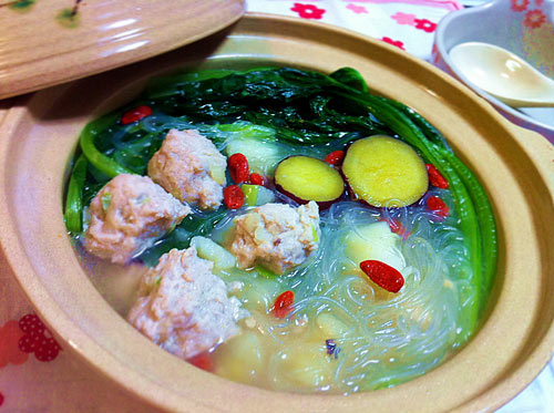6、肉丸煲好好最后放入小白菜和枸杞。小白菜一定不要煲时间太长,2或3分钟左右就可以了。最后收火前放入适量盐和味精即可。