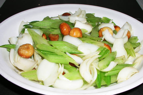 西芹食用方法较多,可生食凉拌,可荤素炒食、做汤、做馅、做菜汁、腌渍等,具有平肝清热,祛风利湿的功效。鲜百合润肺止咳,清心安神。 这两种食材搭配清淡、可口再加上炸过的夏果使其口感更加丰富。绿色的西芹、白色的百合、金色的夏果交相辉映足以让你的味蕾跳动。