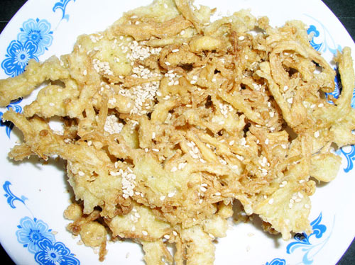 及以下步骤:金针菇去掉老根,洗净撕散,捞出沥干水分。 鸡蛋打入碗里,加入盐、胡椒粉、淀粉调成糊状制成蛋糊。 金针菇去掉老根,洗净撕散,捞出沥干水分。 鸡蛋打入碗里,加入盐、胡椒粉、淀粉调成糊状制成蛋糊。 金针菇去掉老根,洗净撕散,捞出沥干水分。 鸡蛋打入碗里,加入盐、胡椒粉、淀粉调成糊状制成蛋糊。 将芝麻用小火哄香备用。 大火烧热炒锅中的油,取少许金针菇放入蛋糊中,使金针菇均匀的裹上蛋糊。 放入油里炸至金黄色捞出沥干油分,用同样的方法将所有金针菇炸好装盘。 撒上芝麻即可。