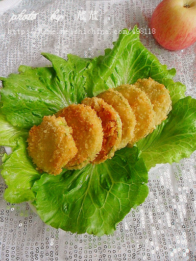 及以下步骤:切片的西葫芦放在面糊里粘匀。 再放在面包糠上裹匀。(像不像雪饼?) 锅内倒油加热后,把蔬菜饼放入炸。 炸制金黄色后出锅,控油。 苽苽自创的蔬菜雪饼就做好了。 看,那馅,想知道什么口感吗?外面很脆的,里面软糯!,配着生菜吃,一点也不油腻! 锅内倒油加热后,把蔬菜饼放入炸。 炸制金黄色后出锅,控油。 苽苽自创的蔬菜雪饼就做好了。 看,那馅,想知道什么口感吗?外面很脆的,里面软糯!,配着生菜吃,一点也不油腻!