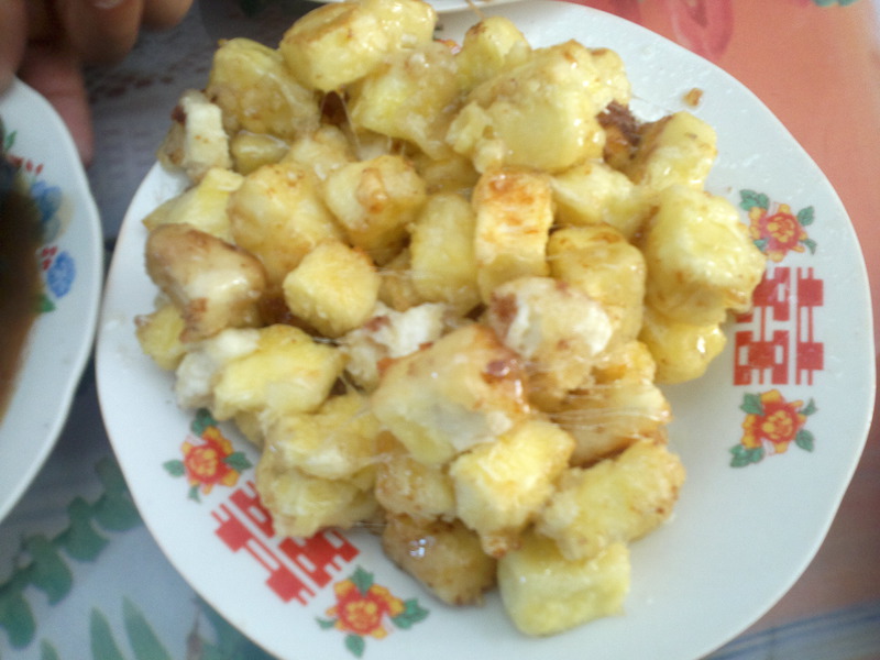 制作美食拔丝奶豆腐。