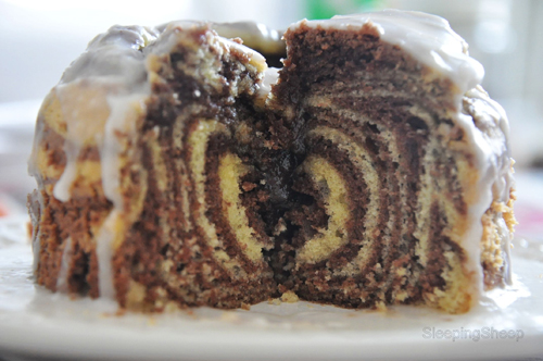 及以下步骤:蛋糕模刷上黄油。先舀两勺没可可的面团,放在蛋糕模中央。 再舀两勺有可可的面团,正浇在之前的面团上面。 如此反复,直到面团用完。 蛋糕放入预热好的烤箱里,160度,40分钟。 糖粉过筛,和橙汁搅拌均匀。 蛋糕烤好后,小心地从模具里拿出,等凉。将糖粉汁浇在蛋糕上,即可。 如此反复,直到面团用完。 蛋糕放入预热好的烤箱里,160度,40分钟。 糖粉过筛,和橙汁搅拌均匀。 蛋糕烤好后,小心地从模具里拿出,等凉。将糖粉汁浇在蛋糕上,即可。