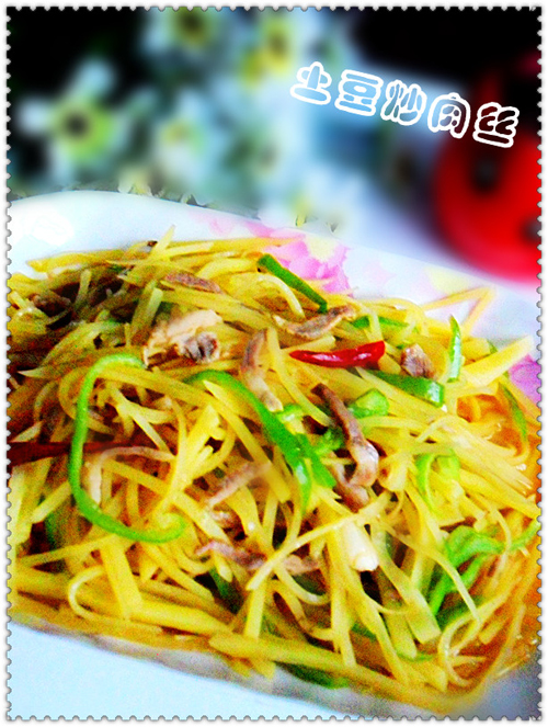 及以下步骤:猪肉洗净切丝 土豆洗净切丝,土豆泡在清水里反复冲洗,尽量把土豆里的淀粉洗干净 猪肉洗净切丝 土豆洗净切丝,土豆泡在清水里反复冲洗,尽量把土豆里的淀粉洗干净 猪肉洗净切丝 土豆洗净切丝,土豆泡在清水里反复冲洗,尽量把土豆里的淀粉洗干净 猪肉洗净切丝 锅烧热至五成热,倒入油烧热,放入肉丝炒至八成熟,放红辣椒、葱炒香 放入土豆丝加少许酱油、盐翻炒至变软 最后放青辣椒、蒜翻炒片刻,加味精即可出锅