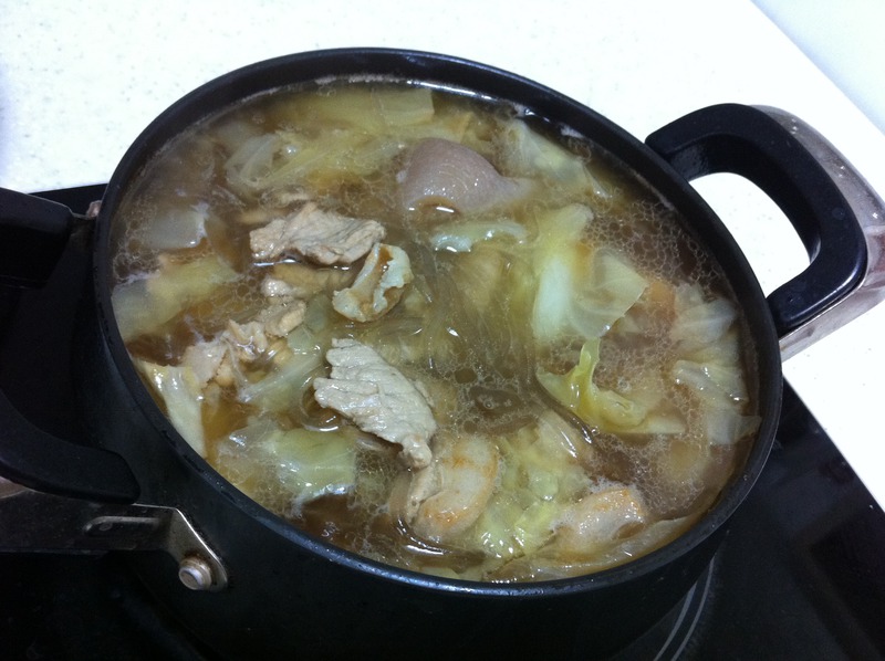 5、炒好的猪肉圆白菜转入煮锅,放入适量清水,加适量盐,大火烧开,十分钟。