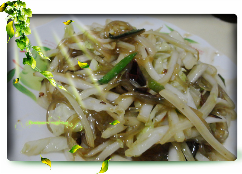 7、分别倒入粉条、白菜翻炒两下,然后倒入调料汁,继续翻炒。。。。好了,出锅!
