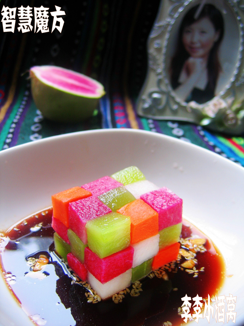及以下步骤:上桌即可。 准备的材料。 三种萝卜和莴笋分别去皮切丁,用盐腌制一下。 准备的材料。 三种萝卜和莴笋分别去皮切丁,用盐腌制一下。 碗中倒入生抽、醋。 淋入香油。 加入白糖、鸡精、熟芝麻和蒜粒。 碗汁淋入已堆好的魔方中。 上桌即可。