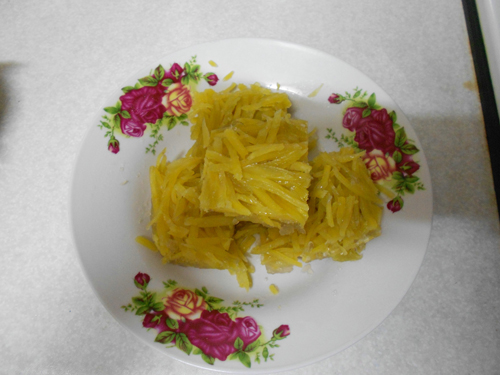 及以下步骤:红薯切丝,糖,玉米粉等备用 红薯丝先泡水10分钟,在晾干 红薯切丝,糖,玉米粉等备用 红薯丝先泡水10分钟,在晾干 红薯切丝,糖,玉米粉等备用 红薯丝先泡水10分钟,在晾干 加入糖拌匀 在拌入玉米粉 拌匀后,倒入容器中,用勺子压平,放入已经有蒸气锅里,蒸20分钟 已经蒸好的