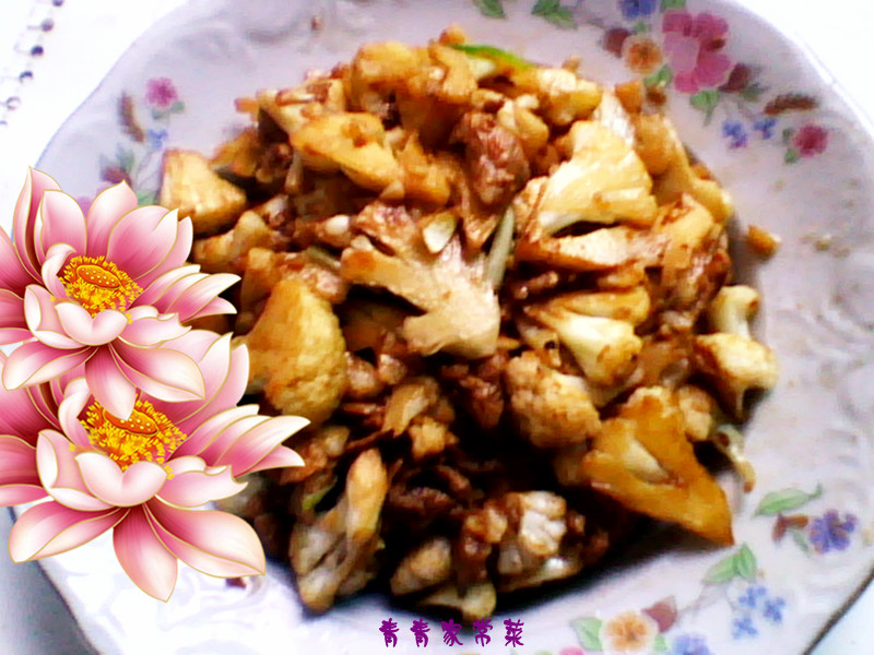 及以下步骤:花菜冼净切片 锅内放猪油烧开加入肉片翻炒加盐 花菜冼净切片 锅内放猪油烧开加入肉片翻炒加盐 花菜冼净切片 锅内放猪油烧开加入肉片翻炒加盐 花菜冼净切片 锅内放猪油烧开加入肉片翻炒加盐 待肉炒干水分加入花菜片翻炒,在花菜上撒点盐来回炒熟。 出锅前淋上生抽即成