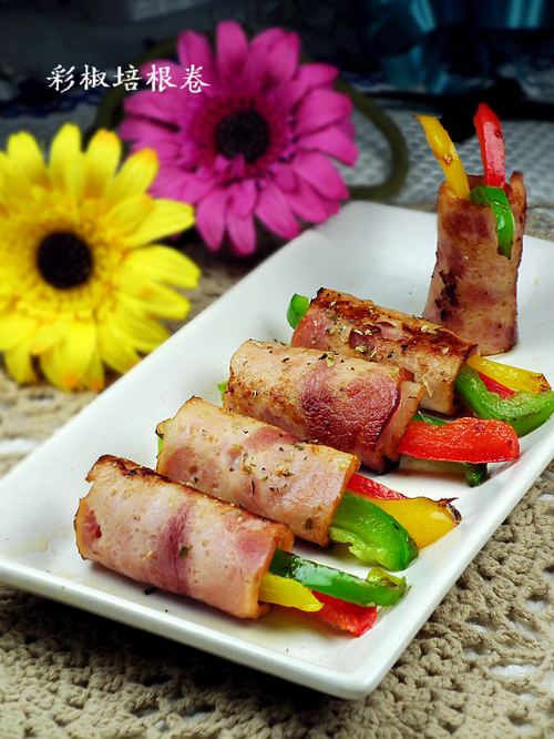 及以下步骤:彩椒分别切成丝备用。 培根从中间切断。 彩椒分别切成丝备用。 培根从中间切断。 彩椒分别切成丝备用。 培根从中间切断。 把彩椒丝放在培根的一头。 轻轻的卷起。 煎锅放入少量的油,把培根卷的封口朝下码放在锅中。 小火煎至培根变色,撒上黑胡椒碎即可。