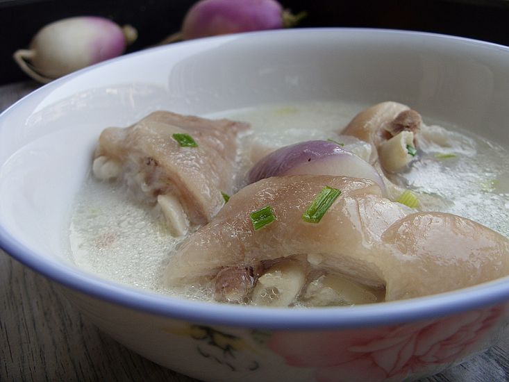 及以下步骤:在煮猪蹄的时候,将萝卜洗净切滚刀块。 3小时后,将萝卜倒入汤锅中同煮15分钟。 萝卜软烂后,放入适量的盐,少量的鸡精调味,撒上香葱即可关火装盘。 锅中烧水,放猪蹄下锅煮2分钟。 将猪蹄捞起,用水洗去浮沫,沥干水分备用。 汤锅洗净,放没过猪蹄的水,放一片香叶,两篇生姜片下锅和猪蹄同煮。 滴几滴白醋下锅,盖上盖子,大火烧开,转小火慢煮3个小时。 在煮猪蹄的时候,将萝卜洗净切滚刀块。 3小时后,将萝卜倒入汤锅中同煮15分钟。 萝卜软烂后,放入适量的盐,少量的鸡精调味,撒上香葱即可关火装盘。