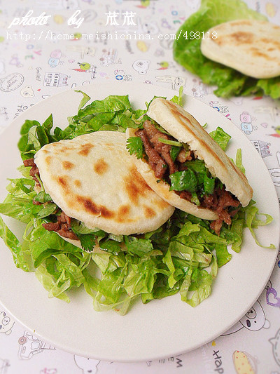及以下步骤:揉好后用保鲜膜盖着醒半个小时。 这是发酵好的面团。(用手按下面团不回缩,就表示发酵好了) 然后拿出擀成条状后切成小块,揪一小团面粉团在油内裹匀。 把沾有油的面团放在擀好的面团上。 按好收口后,再按扁即可。 锅烧热后把馍放入每面用小火慢煎3分钟。 煎好后翻面煎至另一面。 锅内倒少许油,把馅料放入翻炒香。 然后和香菜末搅拌好备用。 这是我第一次做面食,做的不好请见谅!