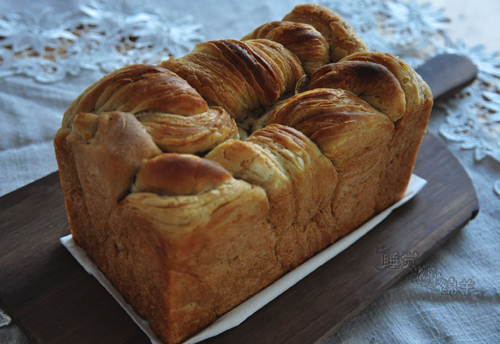 上次做可颂是上了一天课后,叠被子怎么的怎么也叠不动。 后来出来的层次就一般般。 那天就想着,要用可颂的手法做次面包。 面团:黄油=4:1,拧、再辫成麻花,使表面形成波浪一样的形状。 非常香的一款面包。 优点:扑满黄油香,外脆内软,好吃好看好玩。 缺点:也正是因为外脆内软,切不了薄片。切厚片,或者用手撕着吃吧,最近不是流行这样嘛╮(╯▽╰)╭