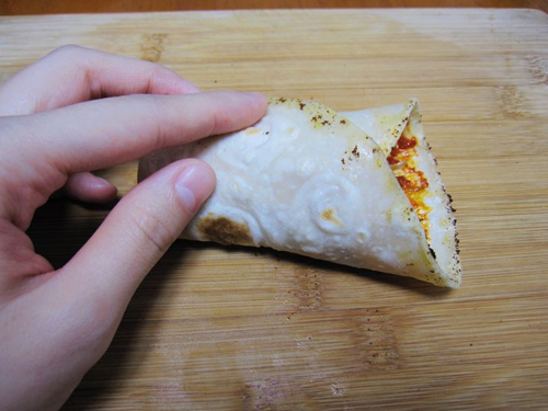 及以下步骤:鸡肉粒放入不粘锅,煎熟即可。 出锅就被我偷吃了一些。o(∩_∩)o~ 面团分小剂子,擀成薄片,放入不粘锅,两面起泡就可以了。 我煎完鸡肉偷懒没洗锅子,面皮的边边就有煎鸡肉的黑点点。 面皮涂上辣椒酱,放上鸡肉粒和喜欢的菜。 先将上面盖下。 再将左边盖上。 将下面往上面翻,就可以吃了。 再将左边盖上。 将下面往上面翻,就可以吃了。