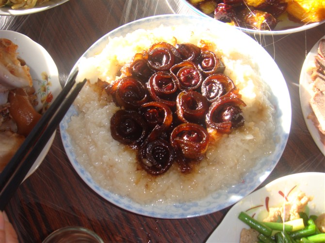 1.先把江米蒸熟拌上糖。 2.五花肉切成薄片。 3.每一片肉沾匀豆沙卷上大枣,放入碗底。 4.然后把饭放在肉上。 5.大火蒸30分钟即可,扣入盘中。